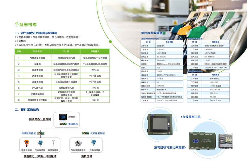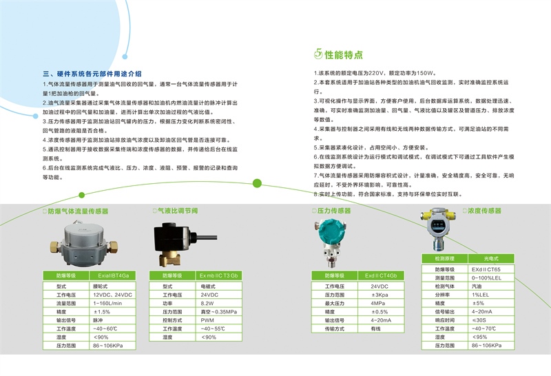 性能特點:該系統額定電壓為220V,額定功率為150w。2、本套系統適用于加油站各種類型的加油機油氣回收監測,實時準確監控系統運行。3可視化提作與顯示界面,方便客戶使用,后臺數據庫造算系統,數據處理迅速,準確可實時監測加油量、回氣量、氣液比值以及罐區及管道壓力、排放濃度等數值。4.采集器與控制器之間采用有線和無線兩種數據傳輸方式,可滿足油站的不同需求5.采集器景緊湊化設計,占用空間小、方便安裝,6.在線監測系統設計為運行模式和調試模式,在調試模式下可通過工具軟件產生模擬數據方便調試7、氣體流量傳感器采用防爆容積式設計,計量準確,精度高,可靠,無響應延時,不受外界環境影響,可靠性高。8實時上傳功能,符合標準,支持與環保單位實時互聯